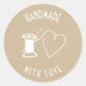 Seamstress tailoring sticker features a cotton reel with needle and heart shaped thread.