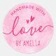 Round sticker with the text "handmade with love" and your custom name in pink on a lighter pink background. The world "love" is written in an elegant calligraphy script font with two white hearts above. Fonts and font colours are customizable. Use as envelope seals, stickers for gifts and favours, product packaging etc. Follow us on Facebook: @businessstationery for more products, news, sales and more.