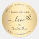 A stylish faux gold looking background, black text. Personalize and add your name and your website url/link. With the text: Handmade with love, by + a small heart.