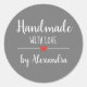 Modern "handmade with love" sticker with a white font on a grey background embellished by a cute red heart. Customize text.