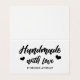 Folded business card in black and white for handmade goods. Handmade with love is written in a gorgeous black font, cornered by hearts, on the cover. Add your name or name of business! Inside, you can write your contact information as well as care instructions - or ingredients list - of the handmade item.