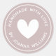 Round stickers with a white heart surrounded by the text "handmade with love" and your name or other custom text on a rose taupe background. Use as stickers for gifts and favours, product packaging etc.