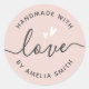 Round stickers with white hearts, the text "handmade with love" and your custom name on a light blush pink background. The word "love" is written in an elegant calligraphy script font. Use as envelope seals, stickers for gifts and favours, product packaging etc. Follow us on Facebook: @businessstationery for more products, news, sales and more.