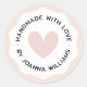 Round stickers featuring a light blush pink heart surrounded by the text "handmade with love" and your name or other custom text with a light blush pink, wavy border. Use as stickers for gifts and favours, product packaging etc.