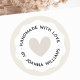 Round stickers featuring a light brown heart surrounded by the text "handmade with love" and your name or other custom text with a light tan, wavy border. Use as stickers for gifts and favours, product packaging etc.