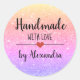 Modern "handmade with love" sticker with a black font on a rainbow glitter background embellished by a cute heart. Customize text.