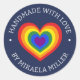 Handmade with love stickers feature a colourful rainbow heart in the centre made of red, orange, yellow, green, blue, and violet concentric hearts on a navy blue background. The custom white text curves around the heart. Personalize the text and add your name in the sidebar. Decorate your products or gifts with flair.