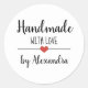 Modern "handmade with love" sticker with a black font on a cardboard background embellished by a cute red heart. Customize text.