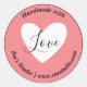 Round stickers with a white heart, the text "handmade with love" and your custom name and website or other custom text on a pink background. The word "love" is written in an elegant calligraphy script. Use as envelope seals, stickers for gifts and favours, or any other product packaging.