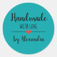 Modern "handmade with love" sticker with a black font on a teal background embellished by a cute red heart. Customize text.
