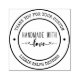 Custom rubber stamp for handmade crafts and products. The wording in the centre reads "handmade with love" in elegant calligraphy with love hearts. The template is set up for you to personalize the typewriter text around the edge, which currently reads "thank you for your custom [your name / business]". Please browse our store for coordinating stickers, labels and tags.