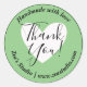Round stickers with a white heart, the text "handmade with love" and your custom name and website or other custom text on an eco green background. The words "Thank You!" are written in an elegant calligraphy script. Use as envelope seals, stickers for gifts and favours, or any other product packaging.