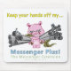 White mousepad with Messenger Plus! logo and a pink cartoon character.