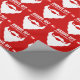 Christmas wrapping gift paper in warm red and white. Reads HANDS OFF until December 25th, fun bold Santa's / father Christmas's famous beard and a no touching hand sign graphic patterned Christmas print. Graphics and design by Sarah Trett.
