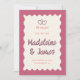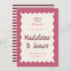 Retro inspired wedding save the date invitation in a bold retro colour palette of pink and red, a wavy frame, with handwriting style fonts, a cute hearts illustration and "we say yes!" This is a fully customizable save the date template, all colours can be changed in the design tool if you like.
