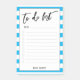 This fun design features a white rectangle surrounded by a sky blue and white striped border. I've added a white striped overlay and the background that shows through can be changed to any colour you like. I've used a casual handwritten font to create a graphic that reads "to do list", and angled it quite large at the top. The word "Date" with a light line appears below the header, and beneath that, ten lines with square check boxes to the left. Your name appears at the bottom in an all caps, serif font that can be changed if you wish. There is an unlined version, as well.