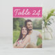 Wedding table number cards feature an an engagement photo of the bride and groom. White casual handwritten style text with hot pink background colour - note, colours can be modified. To order: type in the table number, click "change" by the default photo to upload your own photo, and add that individual table number card to your shopping cart. Repeat for all of the table numbers that you need.