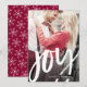 This Christmas holiday photo card features the word "joy" in a modern white handwritten script. Your photo is displayed behind. The back is a crimson and white snowflake pattern but colour can be changed using the customization tool. Select one from the palette or use your own hex number. Graphics ©Prettygrafikdesign