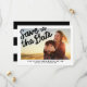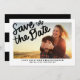 Whimsical and stylish save the date announcement with photo featuring hand written save the date in script, an elegant frame and a striped pattern back.