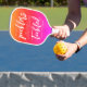 Distract (and get a rise out of) your opponent with this whimsical pickleball paddle, which gives us the admission that "picklers are unlicensed to dink and drive" on a neon pink and orange chalkboard. Reverse shows identical design on a black chalkboard background.