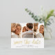 A modern photo collage save the date postcard designed to accommodate three of your favourite engagement photos side by side. "Save the date" appears beneath your photos in gold foil handwritten style script lettering, with your names, wedding date and wedding location beneath.