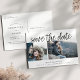 A modern save the date postcard designed to accommodate two of your favourite engagement photos. "Save the date" appears above your photos in black handwritten style script lettering, with your names, wedding date and wedding location beneath