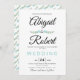 Handwritten typography aqua flowers simple floral wedding invitation. It showcases your names in a cursive script handwritten style typography and two small aqua blue flowers with green leaves on both sides of the ampersand. The backside includes a floral pattern.
