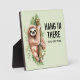 A plaque with text that says: hang in there you got this. Designed with a cute watercolor design featuring a cute sloth hanging onto a tree branch surrounded by green tropical leaves. Light olive green background.