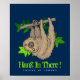 A cute drawing of a brown sloth clinging to a branch with leaves and hanging upside down. Written underneath it says hang in there, friday is coming.