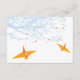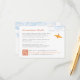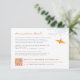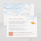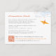 The front of this card features an orange origami paper crane hanging on sky blue branches with tangerine coloured berries against a white background. The backer is a flat dark orange colour background. This is a double-sided wedding details / information / directions enclosure card.