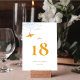The front and back of this card features an orange origami paper crane hanging on sky blue branches with tangerine coloured berries against a white background. This is a double-sided wedding table number card.