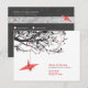 Origami red paper cranes hanging on branches against a white background. The back design is in matching reverse colours. A double sided wedding dinner reception and RSVP card.