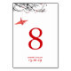 Origami red paper crane hanging on black branches against a light background. This is a double sided wedding table number card.