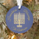Add your name to this midnight blue Hanukkah Blessings ornament with a modern style gold Menorah and elegant gold tone text for a one of a kind personalized keepsake. This simple Menorah graphic is my original design with a pattern of dots on the base barely lighter candles in gold tones. Identical on both sides, this elegant Chanukah ornament is easy to customize for a unique gift.