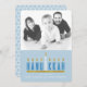 Envoyez des salutations Hanoukka à votre famille et à vos amis avec ce design moderne et personnalisable. L'oeuvre présente les mots "Happy Hanoukka" conçus pour ressembler à une menorah avec des bougies qui brillent - chaque lettre représente une des bougies et le mot "Happy" devient la bougie centrale. Personnalisez-le en ajoutant vos propres salutations et noms en utilisant les modèles de texte fournis. Complétez la conception en remplaçant l'exemple de photo par votre propre photo de famille. L'envers est un bleu assorti avec un design tout-en-un avec un motif Star of David.