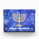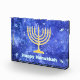 A glowing gold Hanukkah menorah and text reading "Happy Hanukkah" in glowing blue and white superimposed on a blue and white fractal image reminiscent of snowflakes in a storm. Chag Sameach!