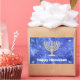 A glowing gold Hanukkah menorah and "Happy Hanukkah" in glowing blue and white text superimposed on a blue and white fractal image reminiscent of snowflakes in a storm. Chag Sameach!
