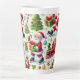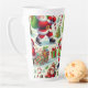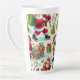 This cheerful latte mug radiates holiday joy with a playful and vibrant design. Santa Claus takes center stage, depicted in a dynamic pose with his signature red suit and twinkling eyes, laughing heartily with his arms open wide. Surrounding him are festive accents: colorful wrapped presents, candy canes, gingerbread cookies, and sparkling Christmas ornaments.