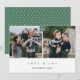 This modern Christmas card features a clean design with two square photos. Simple text, "HAPPIEST HOLIDAYS" appears in muted green on a white background under the photos. Custom text allows you to add your family name. The backside features the same muted green background with a white geometric pattern. Photography © Storytree Studios, Stanford, CA
