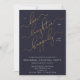 This beautiful, modern Navy Blue White and Gold Happily Ever After Rehearsal Dinner Invitation features a faux gold leaf calligraphy script reading 'To Love, Laughter, and Happily Ever After' as the main design element. The design is beautifully complemented by the modern all cap sans serif font in white, on the navy blue background, announcing the rehearsal cocktail party date and location. The back of the invite features the navy blue, to complete the sophisticated design. Copyright Anastasia Designs, all rights reserved.