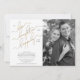 This beautiful, modern Black White and Gold Script Happily Ever After Black and White Photo Horizontal Engagement Party Invite features a faux gold leaf calligraphy script reading 'To Love, Laughter, and Happily Ever After' as the main design element. The text design is beautifully complemented by the modern all cap sans serif font in black, on the crisp, white background, detailing the engagement party time, date and location. The right hand side of the card features your favourite vertical engagement photo, which has a black and white filter applied to it, so you can use your favourite photo and it will print in black and white (toggle the filter off if you prefer a colour image). The back of the card is finished with a modern black and white watercolor texture, to complete the chic design.