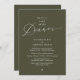 Mark the beginning of your forever with elegance using our contemporary olive green theme wedding elopement Reception celebration invitation card, "Happily Ever After Dinner". Perfect for couples extending their joyous occasion, this invitation exudes sophistication with a hint of playfulness, setting the stage for a memorable event. Adorned with a timeless modern script design theme, it adds a touch of refined charm to your festivities. Crafted by TeeshaDerrick, this invitation promises to beautifully capture your love story.