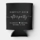 A custom black can cooler for your elopement or post-wedding reception or party with "Happily Ever After Party" in a mix of simple modern white typography and a chic white script with swashes, your first names joined by a heart and your wedding date.