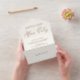 Elegant light cream elopement or small wedding announcement and post-wedding reception all-in-one invitation featuring "Happily Ever After Party" showcased in a blend of simple lettering and a chic modern script, your marriage announcement and reception invitation, and a tear-away RSVP response postcard, all rendered in your choice of genuine gold, silver or rose gold foil.