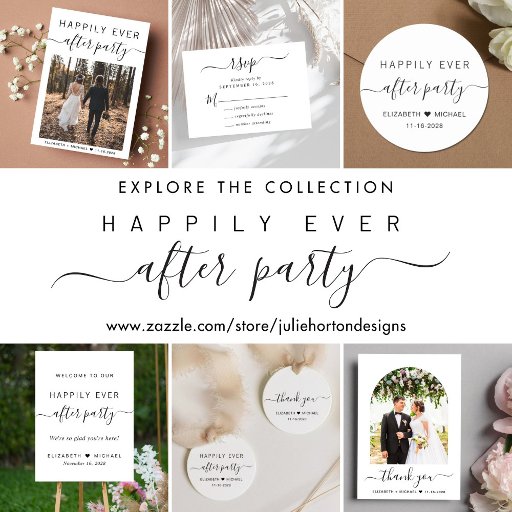 Modern wedding reception party favour with "Happily Ever After Party" in a mix of simple typography and a trendy script with swashes, your first names and the date.