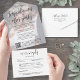 Famille Invitation et amis à une célébration mariage simple et élégante avec des invitations personnalisées "Happily Ever After Party". Avec ce design, les clients peuvent choisir la méthode RSVP qu'ils préfèrent, soit avec la carte postale traditionnelle déchirante à envoyer, ou avec le code QR scannable menant au site Web mariage. De plus, tout libellé est simple à personnaliser pour inclure tous les détails de votre choix. Le design moderne de superposition en noir et blanc présente une calligraphie manuscrite branchée, une typographie chic de style machine à écrire et une photo du couple marié. (CONSEIL EN MATIÈRE DE PLACEMENT D'IMAGE : Une façon simple de centrer une photo exactement comment vous voulez est de la rogner avant de la télécharger sur le site Zazzle.) En scannant le code QR avec leurs téléphones, les invités sont envoyés directement sur le site du mariage pour répondre à l'invitation. Un processus rsvp en ligne réduit le risque que les cartes soient perdues dans le courrier. Il est également plus polyvalent, en ce sens que vous pouvez demander des informations plus détaillées, comme les choix de repas, les allergies alimentaires et les demandes de chant. Toutes les informations de réponse peuvent être customisées ou supprimées. Cette invitation est une façon élégante de demander aux invités mariages de répondre gentiment à votre prochaine célébration de la journée spéciale. Que vous soyez parti, que vous ayez eu un minimalisme réduit ou un micro-mariage, ou que votre célébration spéciale de la journée devait être reprogrammée en raison d'un ajournement de la pandémie, le bonheur jamais après la fête peut encore commencer. Félicitations à la mariée et au marié !
