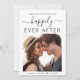 Modern save the date wedding announcement. The front features your photo, "Save The Date For Our Happily Ever After" in a mix of simple typography and trendy script with swashes and your first names and wedding date. On the reverse side, personalize your message in more detail and add your names in a signature-like script.