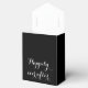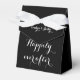These fun wedding favour boxes feature the words "Happily ever after" in white on a black background with the names of the couple right below a white ribbon. This is a beautiful wedding favour box for an elegant wedding reception. Copyright henishouseofpaper