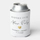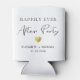 Chic white can cooler favour for your wedding reception or after party celebration featuring "Happily Ever After Party" in a mix of simple typography and a modern script, your first names and reception date and a gold heart.