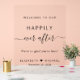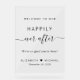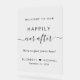 Chic clear acrylic wedding welcome sign featuring "Welcome To Our Happily Ever After" in a mix of simple modern typography and an elegant script with swashes, "we're so glad you're here," your first names joined by a heart and your wedding date.